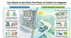 Unlike traditional business signs that stay in the same place for years, custom car magnets turn your car into a moving billboard. They are attached to the vehicles. This way, your brand is noticed wherever the vehicle moves, whether it is on the road or at any parking spot.