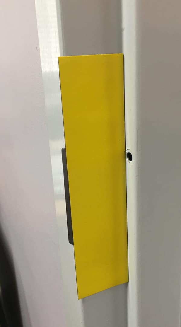 .030″ x 2″ x 8″ YELLOW magnetic strip to be placed over strike plate in a metal doorframe. Enables door to remain locked at all times while blocking the door latch so the room is still accessible. In a lockdown situation, the magnetic strip can be easily pulled off, even with the door closed, so the door is locked and secured in an instant.